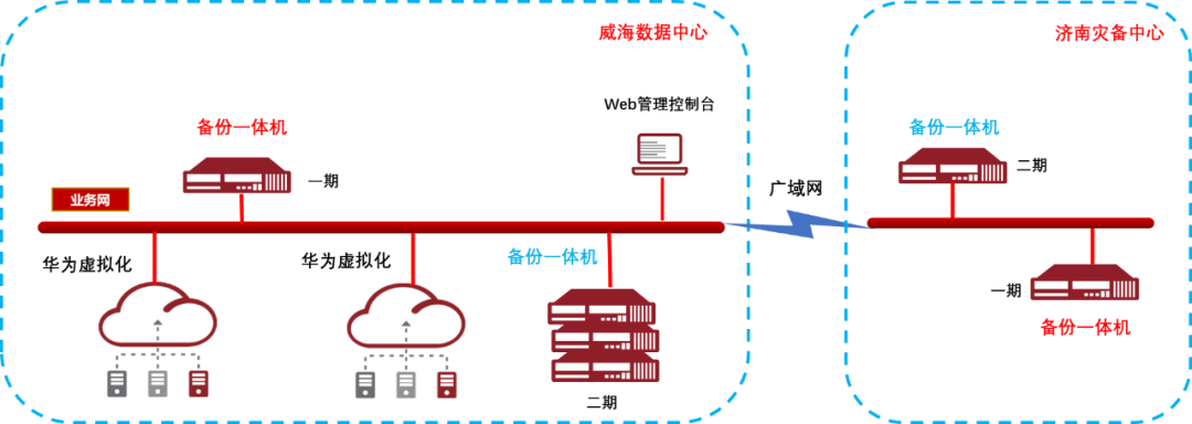 2、雙中心容災解決方案:在威海、濟南兩個數據中心之間統一管理,采用鼎甲數據備份和管理軟件,將區縣政府業務系統,通過云平臺接口統一備份到鼎甲備份一體機上后,將重要備份數據異步傳輸到濟南災備中心,實現數據級容災。