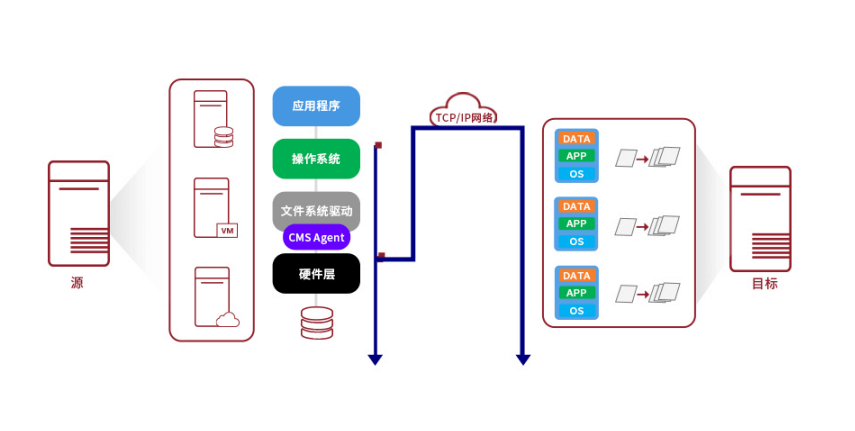 業務系統工作負載 (操作系統、應用程序、數據)一體化遷移至目標端。