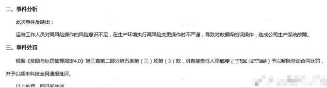 昨日,從順豐傳出來的這封郵件傳遍IT圈,簡意是:一位高級運維人員搞錯了一條命令,誤刪了某個數據庫,數據無法恢復,后果太嚴重了,順豐只好讓他被動跑路。