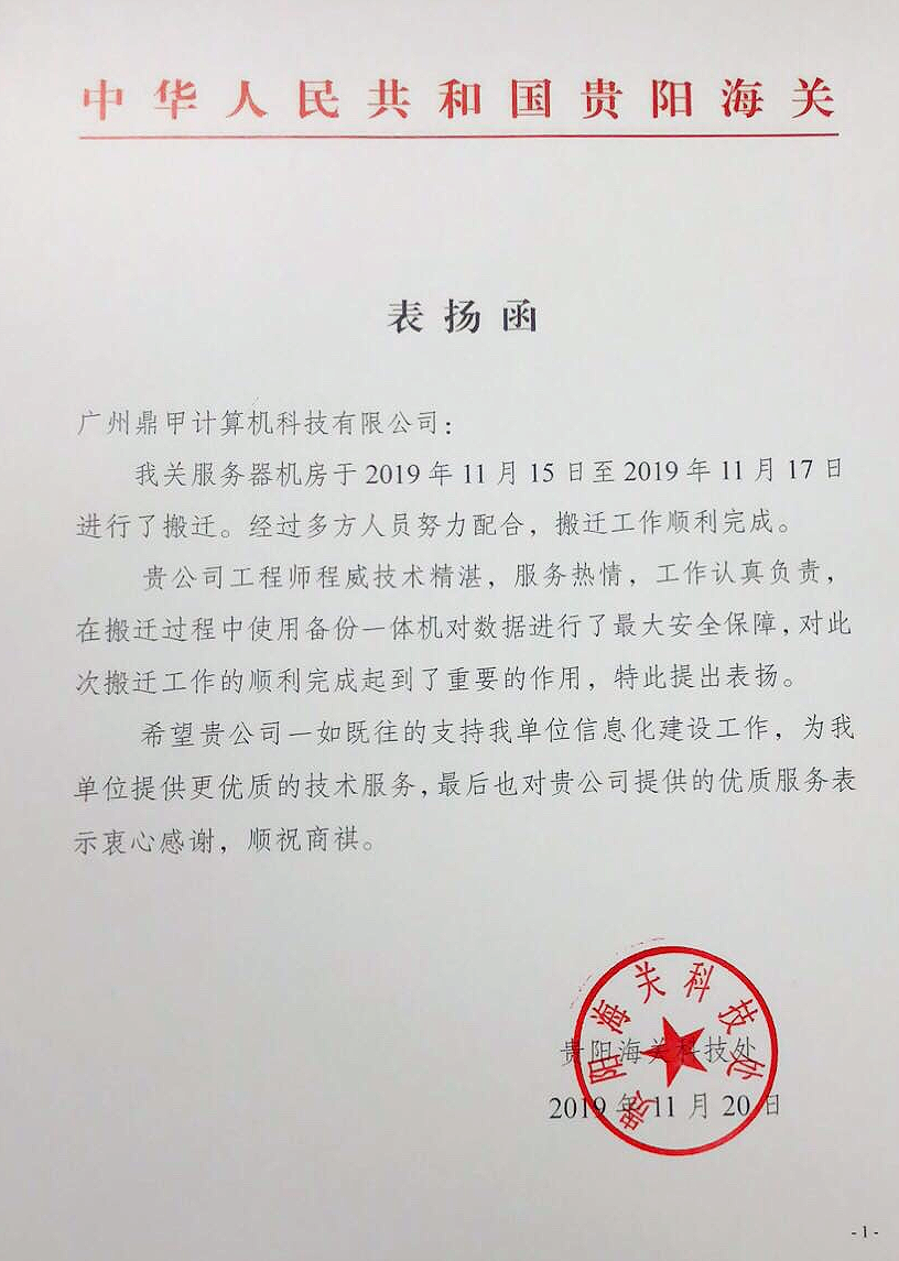 現(xiàn)今,貴陽海關(guān)積極響應(yīng)國家政策,將海關(guān)與檢疫局合并辦公,服務(wù)器機(jī)房也需搬遷到新的辦公地址。在搬遷過程中,鼎甲工程師程威使用鼎甲備份一體機(jī)對貴陽海關(guān)的數(shù)據(jù)給予了最大的安全保障。他技術(shù)精湛,服務(wù)熱情,在搬遷的三天時間里給予了專業(yè)的技術(shù)支持。