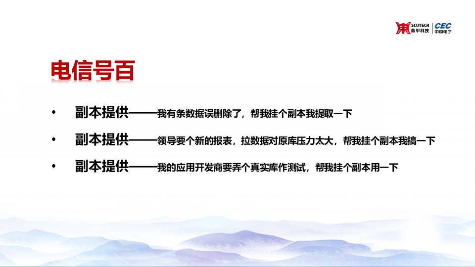 那么根據(jù)這個(gè)CDM的情況呢,我們?cè)O(shè)計(jì)了一些方案場(chǎng)景,就是我們?cè)谙胂裰械膱?chǎng)景,我們今天的主題叫想象與真實(shí)嘛,那我們想象中的場(chǎng)景是怎么樣的? 是我們獲得黃金副本之后進(jìn)行若干個(gè)快照的掛載,去支持這些應(yīng)急、開(kāi)發(fā)、測(cè)試分析等等一些其他的業(yè)務(wù)。