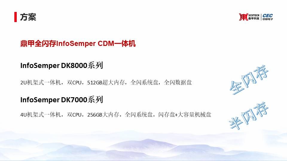 然后我們?cè)诙椎倪@個(gè)CDM的一體機(jī),硬件上也做了一些優(yōu)化,比如說(shuō)我們推出了DK8000系列的全閃存的一體機(jī)。包括了是全閃的系統(tǒng)盤啊,全閃的數(shù)據(jù)盤,大大的提高了我們磁盤的IO,還有就是針對(duì)一些大容量的大數(shù)據(jù)量的這個(gè)用戶的情況,我們的CDM也提供了4U的這種DK7000系列,我們叫它半閃存盤。其實(shí)根本目的也是用來(lái)提高我們的磁盤的IO,提高磁盤IO以后就可以提高整個(gè)掛載恢復(fù)回滾日志的速率。