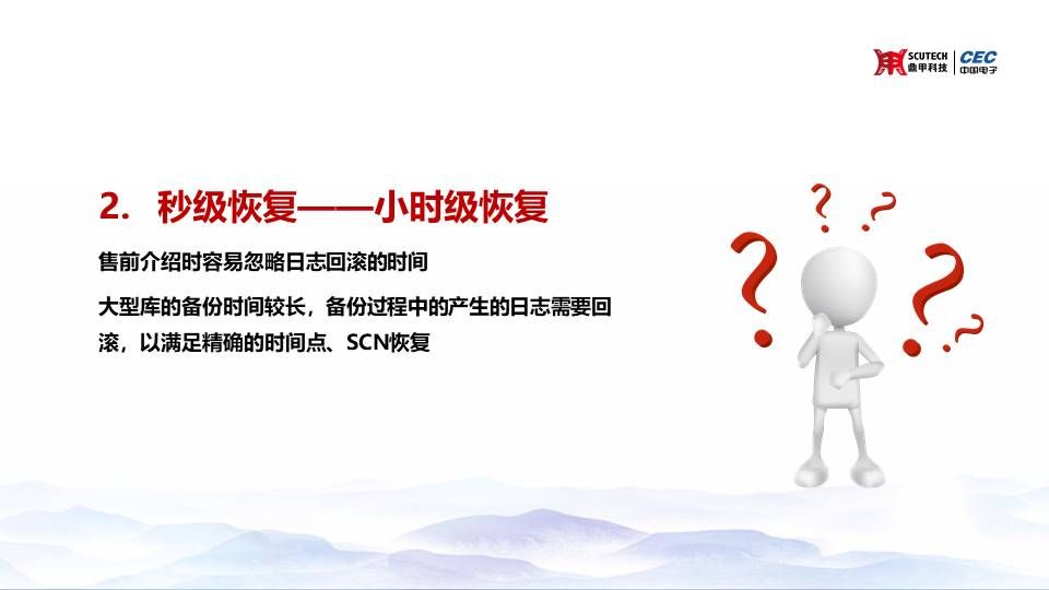 第二種這個(gè)想象與現(xiàn)實(shí)的差距就是你的售前介紹的時(shí)候秒級(jí)恢復(fù),實(shí)際上秒級(jí)恢復(fù)是很難去做到,因?yàn)樗幸粋€(gè)日志回滾的時(shí)間,就說(shuō)我們?cè)谑矍敖榻B時(shí)經(jīng)常會(huì)去忽略掉這個(gè)日志回滾的時(shí)間。大型庫(kù)的備份時(shí)間較長(zhǎng),備份過(guò)程中的產(chǎn)生的日志需要回滾,以滿足精確的時(shí)間點(diǎn)、SCN恢復(fù)。