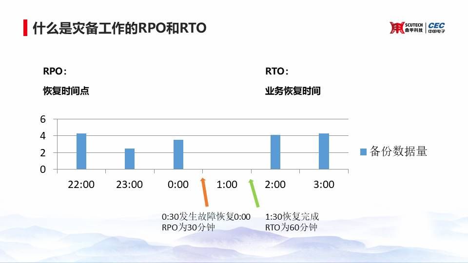 那么在災(zāi)備工作上還有兩個(gè)非常重要的指標(biāo),就是RTO和RPO。RTO是業(yè)務(wù)恢復(fù)時(shí)間,RPO是恢復(fù)時(shí)間點(diǎn)。