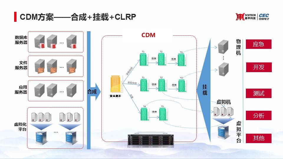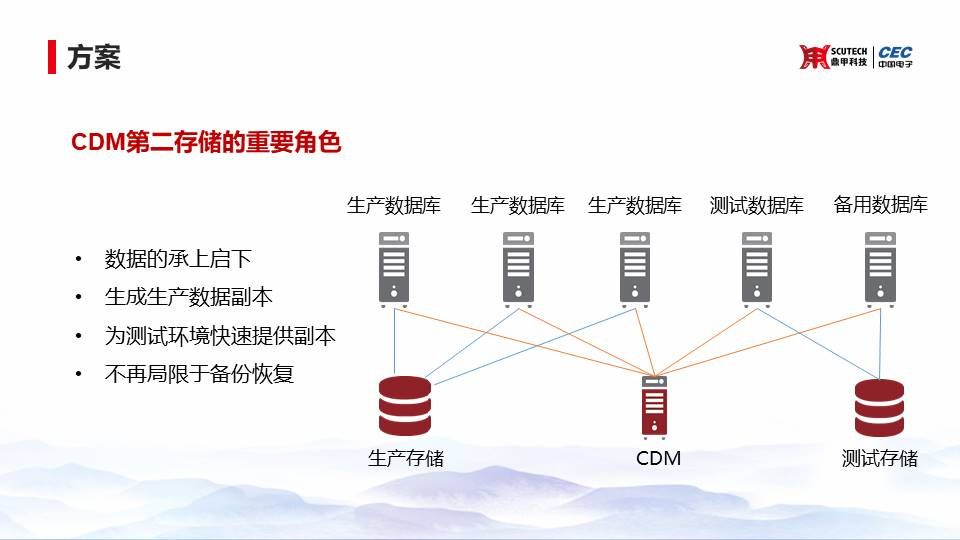 第二種方案呢,我們CDM在整個(gè)的基礎(chǔ)架構(gòu)中扮演的角色,我們?nèi)ネ诰蛞幌碌诙鎯?chǔ)的一個(gè)重要角色。那么在這個(gè)過(guò)程中,其實(shí)CDM這個(gè)系統(tǒng)和生產(chǎn)測(cè)試用的存儲(chǔ)是在同一個(gè)層面的。從生產(chǎn)數(shù)據(jù)到測(cè)試數(shù)據(jù),這么一個(gè)轉(zhuǎn)換過(guò)程是通過(guò)CDM可以去做一個(gè)數(shù)據(jù)的承上啟下,通過(guò)CDM可以去做一個(gè)生產(chǎn)數(shù)據(jù)的副本,快速為測(cè)試數(shù)據(jù)提供副本。