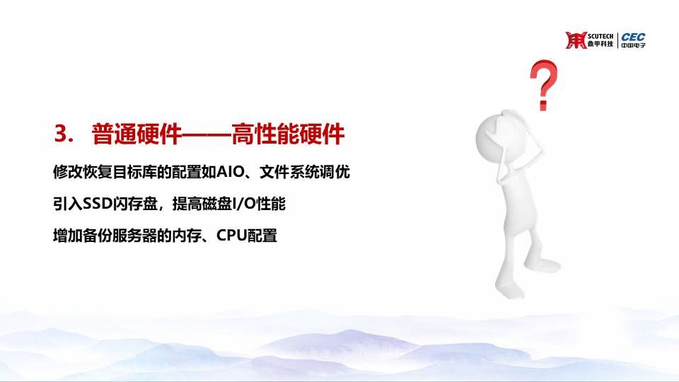 在硬件配置層的想象與現(xiàn)實(shí),基本上有三大塊:修改恢復(fù)目標(biāo)庫(kù)的配置如AIO及文件系統(tǒng)調(diào)優(yōu);引入SSD閃存盤,提高磁盤I/O性能; 增加備份服務(wù)器的內(nèi)存、CPU配置。