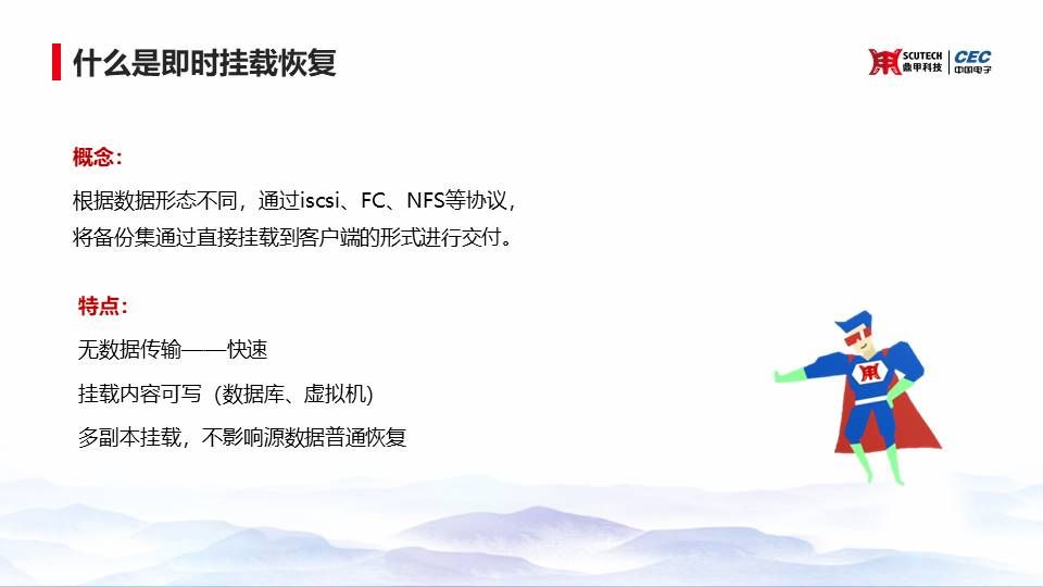 即時(shí)掛載恢復(fù)它的概念是根據(jù)數(shù)據(jù)形態(tài)不同,通過(guò)iscsi、FC、NFS等協(xié)議,將備份集通過(guò)直接掛載到客戶端的形式進(jìn)行交付。主要特點(diǎn)是無(wú)數(shù)據(jù)傳輸、掛載內(nèi)容可寫及多副本掛載。