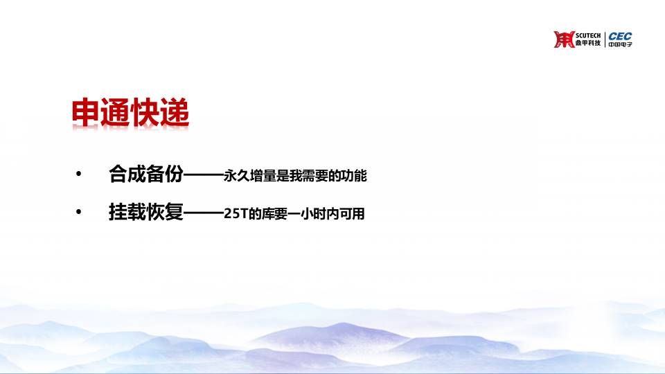 快遞公司它們數(shù)據(jù)庫(kù)的體量是非常龐大的,它主要是要做合成備份,做合成備份的目的是它沒(méi)有辦法周期性的做全量備份。因?yàn)樗坏┳鋈總浞菹喈?dāng)于他這個(gè)數(shù)據(jù)庫(kù)的使用幾乎要停止,所以一定要做永久的增量備份。此外,它還有一個(gè)25T的數(shù)據(jù)庫(kù),當(dāng)它要去生成一個(gè)測(cè)試庫(kù)的時(shí)候,它需要CDM去做掛載恢復(fù)。