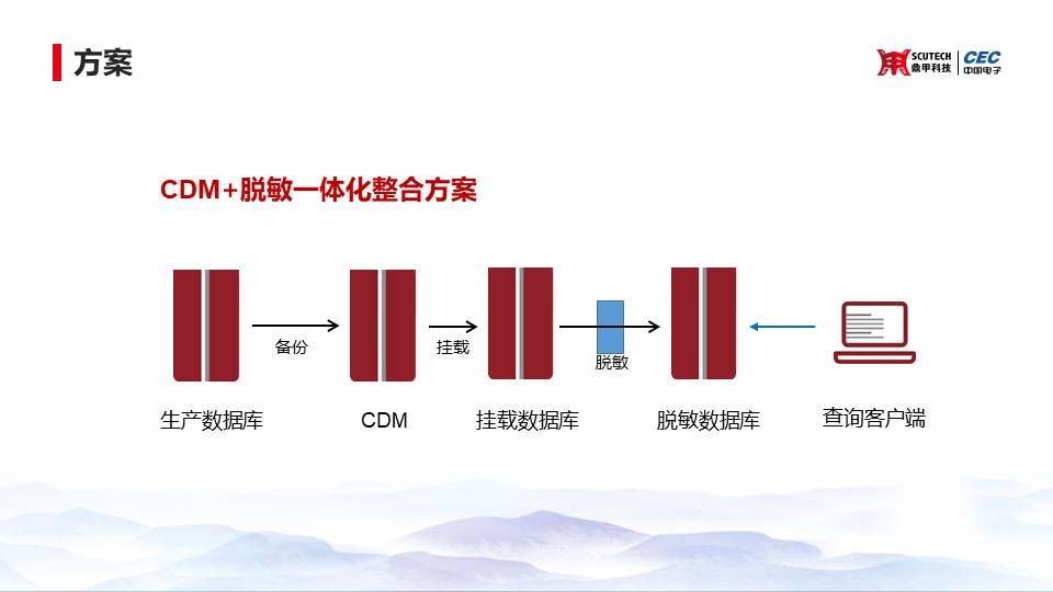 最后我講一下當(dāng)我們遇到了這些想象和現(xiàn)實(shí)的差距之后,鼎甲對(duì)我們CDM的產(chǎn)品在未來(lái)做了一些什么樣的展望?下面這是一個(gè)方案,我們把CDM和脫敏去整合到一起。整合到一起之后呢,也就是說(shuō)將脫敏這件事情,也是離開(kāi)了生產(chǎn)庫(kù)。在做脫敏抽取數(shù)據(jù)和運(yùn)算的這個(gè)過(guò)程,是不需要生產(chǎn)庫(kù)的參與。所以就把脫敏這件事情離你生產(chǎn)更遠(yuǎn),對(duì)你生產(chǎn)就沒(méi)有任何的影響,通過(guò)CDM和掛載數(shù)據(jù)庫(kù)來(lái)實(shí)現(xiàn)這么一個(gè)脫敏的工作。最終用戶是通過(guò)查詢客戶端直接去查詢這個(gè)脫敏的數(shù)據(jù)庫(kù)就可以了。
