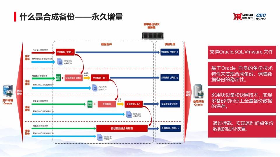 第二個(gè)核心技術(shù)點(diǎn)就是合成備份,合成備份最重要的一個(gè)優(yōu)點(diǎn)就是它是一個(gè)永久的增量備份。我們可以看下面這個(gè)圖,每一塊紅色的都是指那個(gè)初始的全量備份,每個(gè)初始的全量備份加上當(dāng)前的這個(gè)綠顏色的增量數(shù)據(jù)之后,可以組合成為一個(gè)新的全量數(shù)據(jù),就是后面的藍(lán)色這個(gè)方框。每一個(gè)藍(lán)色方塊都成為一個(gè)塊狀的形態(tài),存在我們的CDM服務(wù)器里面。那么這些藍(lán)色的方塊兒可以去干什么?可以去做一個(gè)掛載恢復(fù),那么就引入了我們第三個(gè)核心的技術(shù)叫做即時(shí)掛載恢復(fù)。