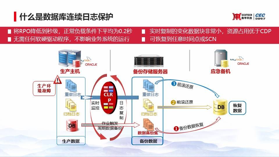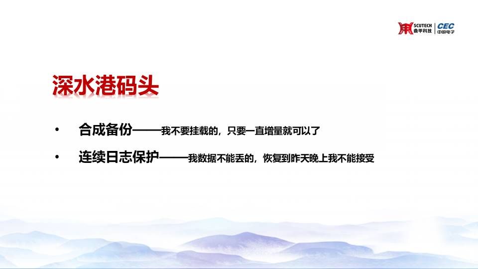 在這些概念的基礎(chǔ)上,CDM是如何來(lái)的呢?CDM一共有三個(gè)非常核心的技術(shù)。第一個(gè)是連續(xù)日志保護(hù),通過(guò)一個(gè)定時(shí)的數(shù)據(jù)備份,再加上我們實(shí)時(shí)的連續(xù)日志保護(hù),可以將數(shù)據(jù)庫(kù)的數(shù)據(jù)非常完整的去保存。它和CDP有一個(gè)本質(zhì)的區(qū)別,就是我們備下來(lái)的每一個(gè)日志都是能保證它是可恢復(fù)的。