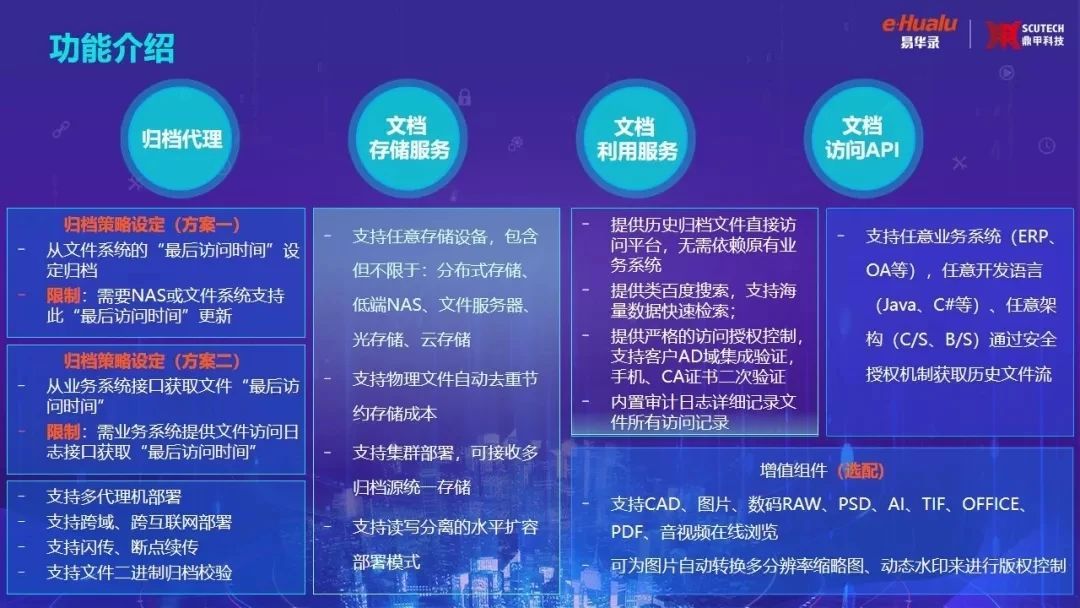 此外,無論數據是在云端還是藍光,歸檔后的數據均可在本機生成存根,用戶可直接訪問,同時,它還具備強大的平臺擴展能力和業務場景適應能力,如應用集成、應用快速構建、業務流程設計整合、智能化大數據管理等。