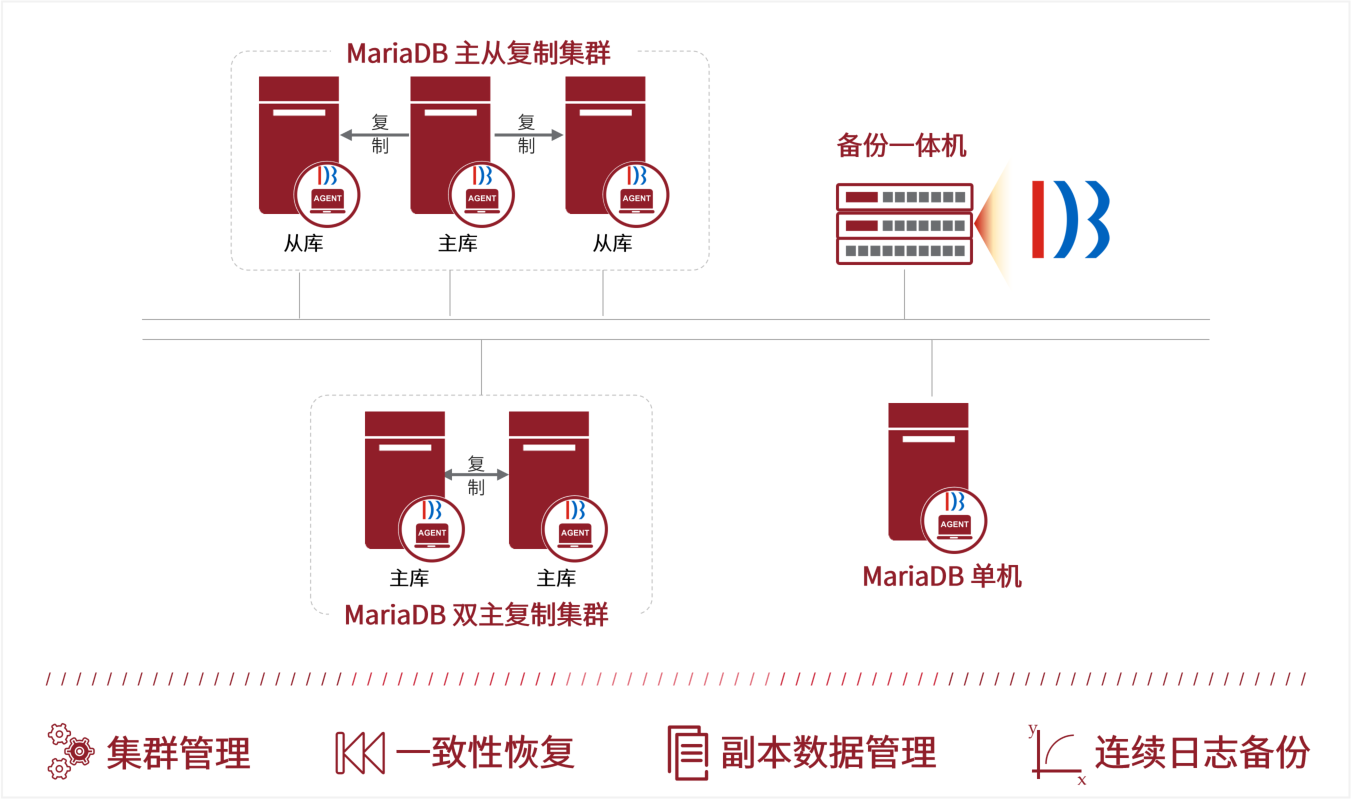 DBackup 在支持單機 MariaDB 的基礎上,再支持 MariaDB 主從復制、雙主復制集群的備份恢復,豐富了數據保護的整體解決方案。MariaDB 雖與 MySQL 同源,但全局事務標識符(GTID)卻差異巨大,為了能保障數據庫的一致性恢復,鼎甲研發團隊進行了層層技術攻關,最終實現了 MariaDB 指定 GTID 的物理恢復!