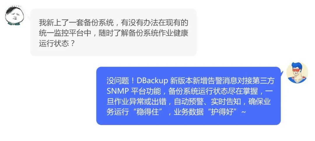 DBackup 新增支持向第三方 SNMP 平臺自動、實時推送告警信息,例如,客戶監(jiān)控運維平臺。DBackup 新版本實現(xiàn)告警信息歸并、匯總、跟蹤,運維人員通過可視化界面進行全局運維監(jiān)控,實時把握業(yè)務系統(tǒng)的健康狀態(tài),確保備份恢復工作正常進行。