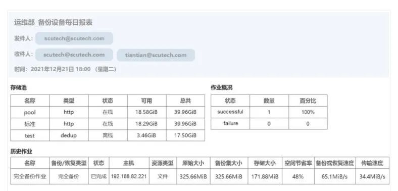 DBackup 平臺可以自動生成關于作業(yè)概覽、存儲池狀況、歷史作業(yè)等數(shù)據(jù)的運維報表,每天定時、自動發(fā)送到單位各部門指定郵箱,運維情況即時反饋。運維人員通過運維報表,全面掌握備份作業(yè)、資源等運維狀況,確保備份恢復運維工作有條不紊。