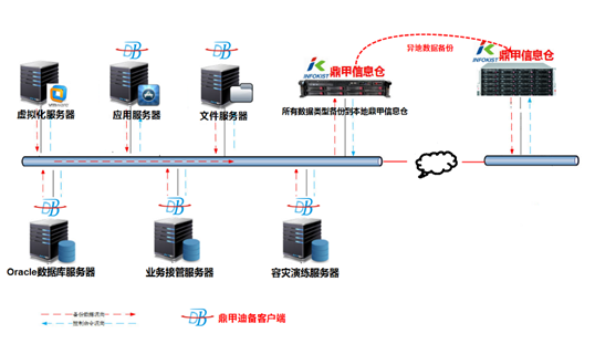 結(jié)合集團(tuán)的網(wǎng)絡(luò)環(huán)境和客戶端的需求,在網(wǎng)絡(luò)中的部署一臺(tái)鼎甲信息倉(cāng),在需要備份的服務(wù)器上安裝代理軟件,同時(shí)在異地部署一臺(tái)鼎甲信息倉(cāng)作為云復(fù)制的存儲(chǔ)服務(wù)器,將備份的數(shù)據(jù)自動(dòng)復(fù)制到存儲(chǔ)服務(wù)器。考慮到數(shù)據(jù)的重要性以及客戶的存儲(chǔ)空間,數(shù)據(jù)庫(kù)備份采取每周一個(gè)全備,六個(gè)增量,保留兩周的數(shù)據(jù),起到很好的保護(hù)作用。