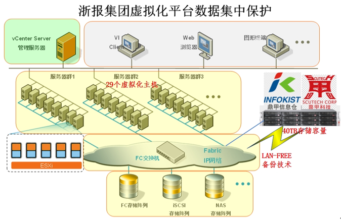 隨著虛擬時代的到來,虛擬化平臺被浙江報業集團信息中心采用,隨之而來的虛擬化平臺的數據備份問題也開始困擾管理人員。目前浙報集團眾多應用系統運行在虛擬化的平臺,擁有29臺虛擬化宿主機平臺,這樣就需要專業完整的虛擬化平臺備份一體化解決方案,通過備份產品,自動將指定的400多個虛擬機通過LANFREE技術備份到備份一體化設備,每臺虛擬機可以保留1周的備份時間點,當虛擬機崩潰、核心數據丟失、應用被破壞甚至宿主機損毀的情況下,用戶能通過簡單的圖形化快速恢復備份虛擬機到指定時間點,為用戶虛擬化平臺運行保駕護航。