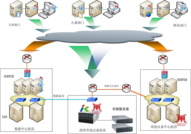 Cities build relatively independent backup sub-servers using InfoKist which then are connected with provincial cloud backup platform through a special line to synchronize data. With off-site high availability technology of Scutech, a remote virtualization platform can be built as a business takeover disaster recovery center. Once an accident occurs, it can instantly take over the business server and maintain normal operation. In terms of management and monitoring, users only need to log onto the web interface to set up and manage clients. Municipal departments are independent from each other while provincial departments can perform unified management.