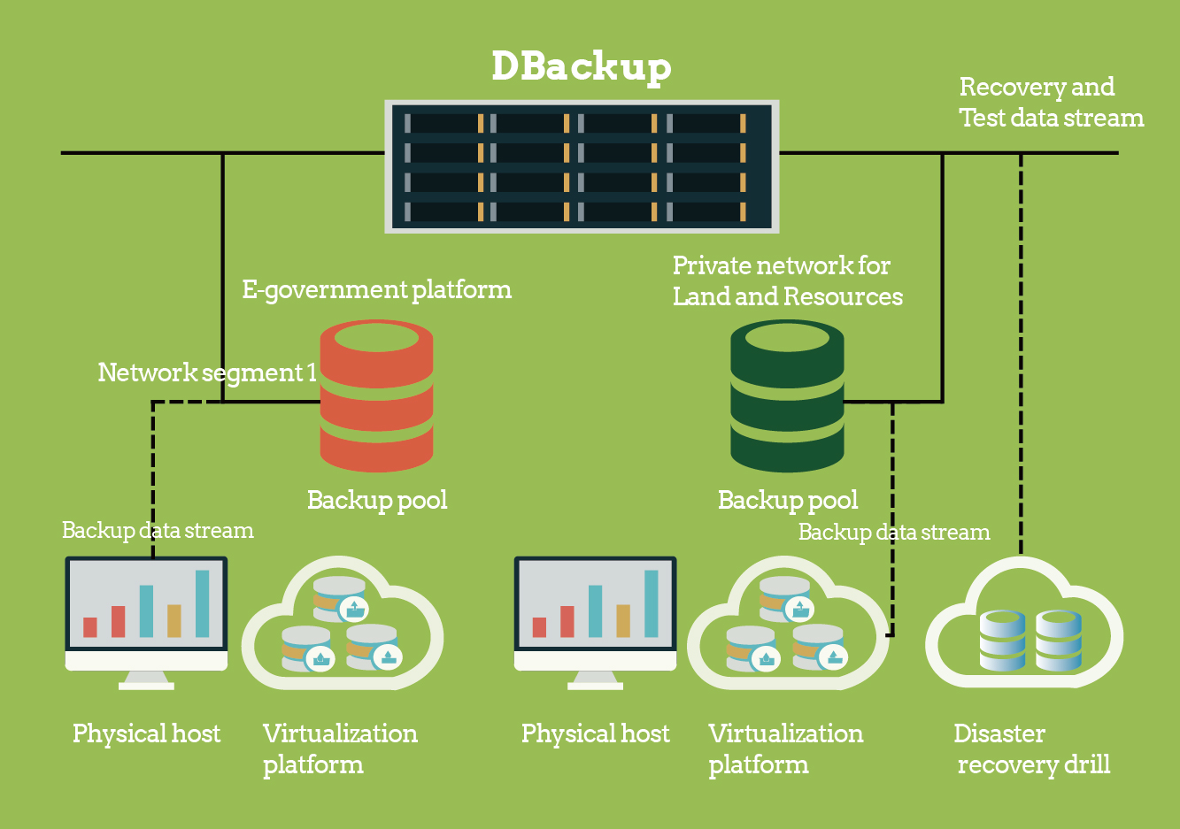 The bureau was instructed to implement a ‘Geospatial framework’ programme including an e-government platform and a private network for land and resources. The programme has several key business systems: a front-end WEB system, a back-end GIS system, a city-county integrated system, a sub-service system, a virtualization support system, databases and self-developed applications, which are based on two distinctive network segments on Windows, Linux, and VMware hybrid IT architecture. Any data loss could result in business downtime and incalculable economic loss. The challenge is to improve resource utilization ratio and optimize system performance meanwhile simplifying deployment and subsequent management process.